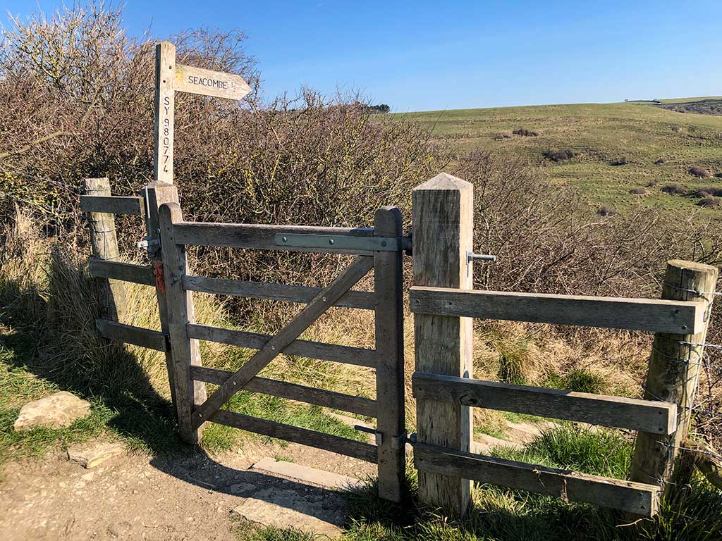 You may want to explore the village green and duck pond before starting the walk. Next to the pond is a visitor information board with good map of the area which I’ve copied below for you. At the bottom of the green near to the red phone box you can see a sign pointing left to Seacombe which you can follow leading you down a path between the cottages and out into a field which you have to cross. I’ve marked it as a dotted yellow line on the map below.